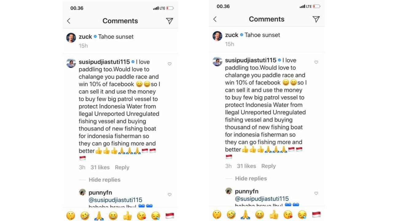 "I love paddling too. Would love to challenge you paddle race and win 10% of Facebook, so I can sell it and use the money to buy few big patrol vessel to protect Indonesia water from illegal unreported unregulated fishing vessel and buying thousand of new fishing boat for Indonesian fisherman so they can go fishing more and better," komentar Menteri Susi lewat akun Instagramnya @susipudjiastuti115.