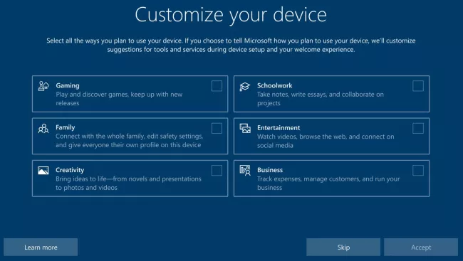 "Kami tengah menjajaki hasil dari masukan yang masuk untuk menambahkan halaman penyiapan Windows untuk membantu memahami bagaimana pengguna ingin menggunakan perangkatnya dan membantu penyesuaian perangkat sesuai tujuan," kata Microsoft.