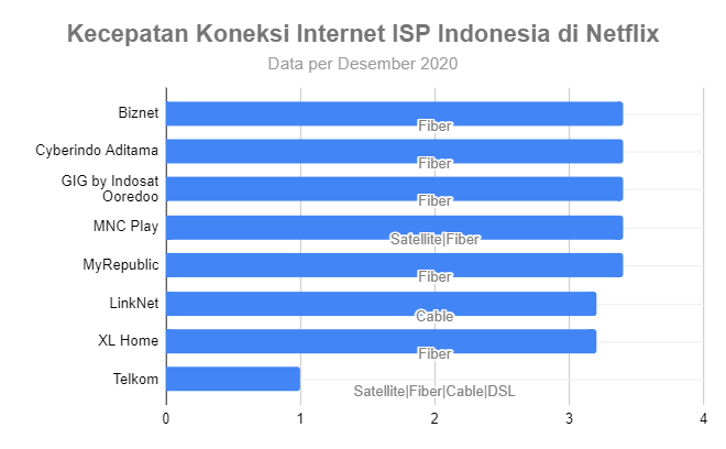 Dari beberapa ISP tersebut, Biznet mencatatkan diri sebagai ISP Indonesia tercepat yang digunakan oleh pengguna Indonesia untuk mengakses Netflix. Rata-rata kecepatan yang dicapai oleh penyedia layanan internet berbasis fiber itu mencapai 3,4 Mbps di Netflix.