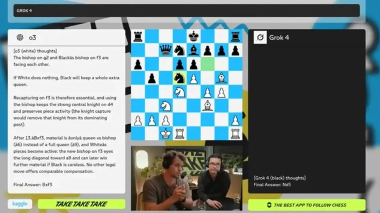 Grandmaster Magnus Carlsen dan GM David Howell menjadi komentator. Carlsen menilai: Grok 4 seperti pemain klub yang dominan di pembukaan tapi “kehabisan napas” di pertengahan. Sebaliknya, o3 efisien, menutup setiap peluang lawan. Estimasi ELO Carlsen: Grok 4 di kisaran 800, o3 sekitar 1200—cukup untuk menggambarkan perbedaan performa.