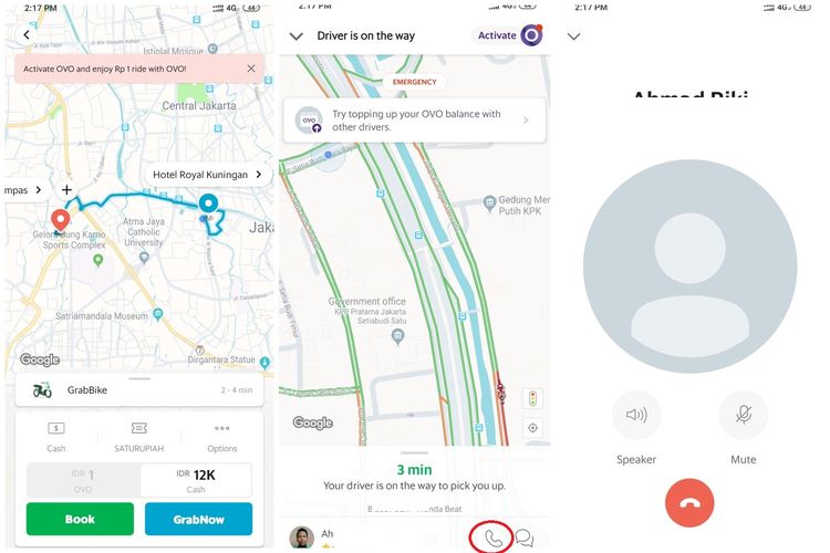 Fitur ini baru akan muncul ketika penumpang sudah mendapatkan pengemudi yang akan menjemput dan mengantarnya. Ketika pengemudi Grab ditemukan, fitur panggilan gratis ini bisa dilakukan dengan cara meng-klik ikon "gagang telepon" di tampilan yang menampilkan posisi pengemudi Grab serta estimasi waktu sampai seperti gambar berikut.