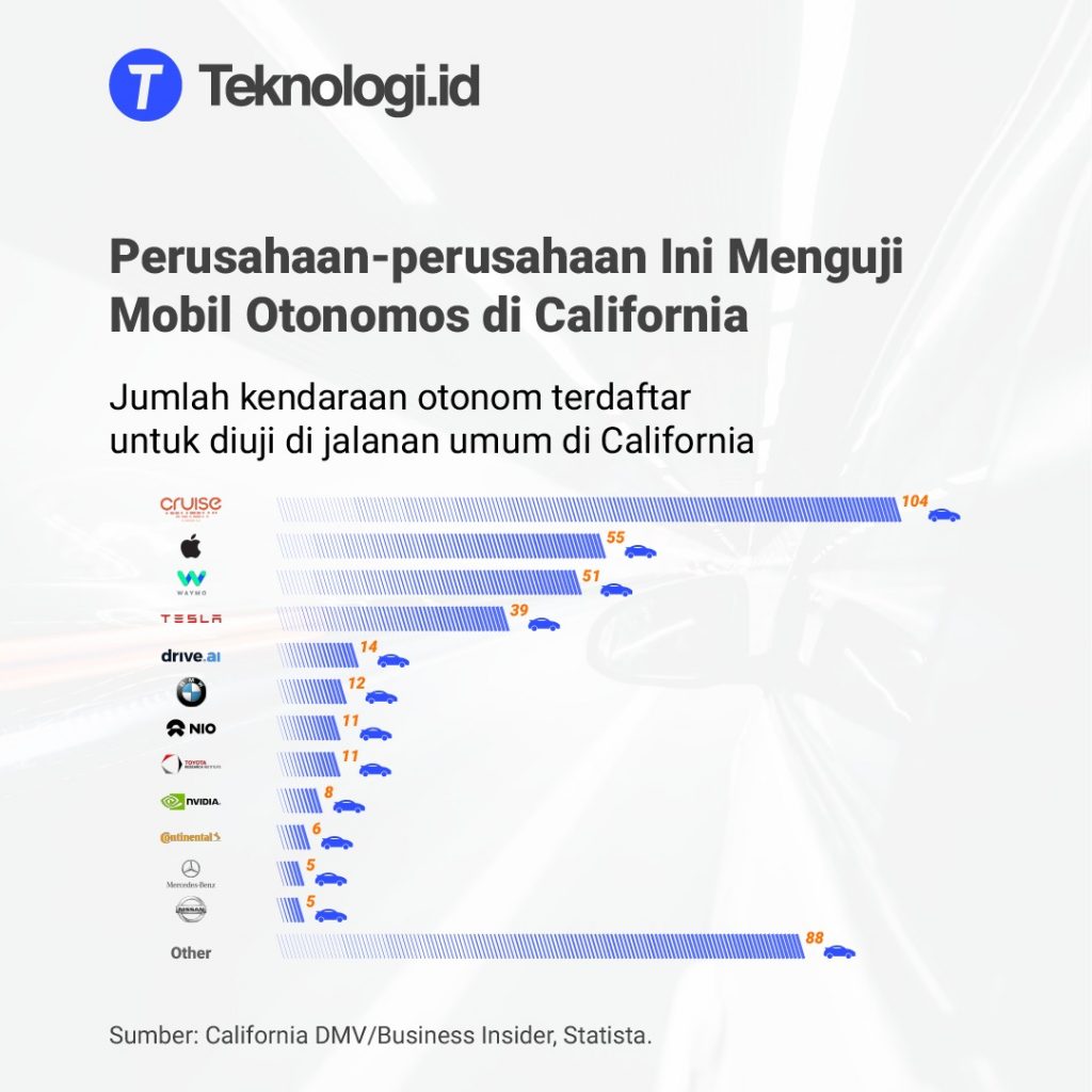 self-driving, baru-baru ini menerbitkan daftar berapa banyak kendaraan mobil otonomos yang saat ini terdaftar untuk uji mengemudi di negara tersebut. Anehnya, Apple, yang bisa dibilang di luar industri tersebut, berada di urutan kedua dalam daftar itu dengan 55 kendaraan disetujui untuk diuji di jalan umum California. Perusahaan yang berpusat di Cupertino tersebut belum melakukan uji coba otonom tahun lalu, menurut database DMV tentang laporan pelepasan kendaraan otonom wajib untuk tahun 2017.