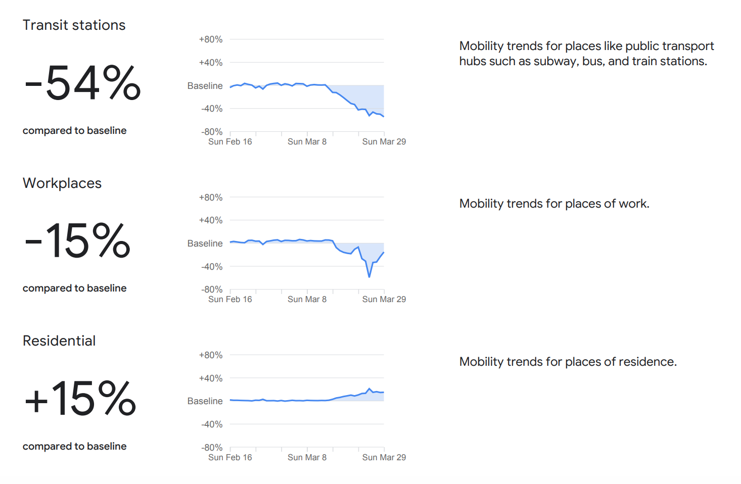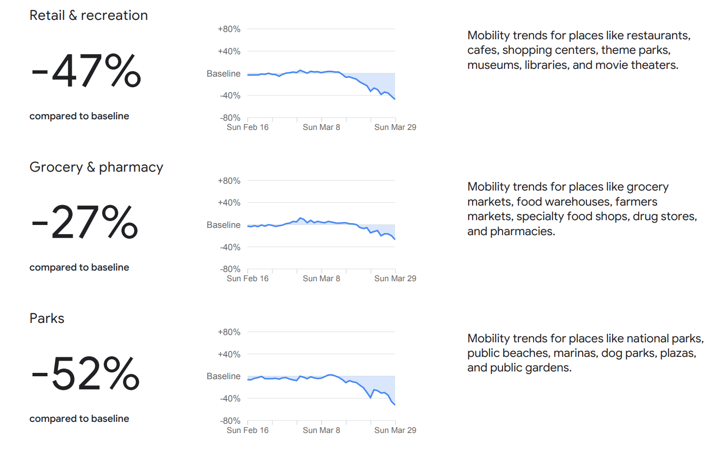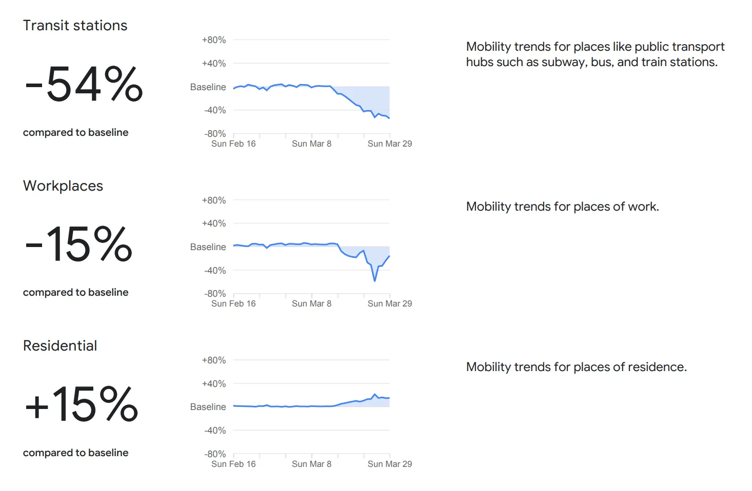 Laporan Google yang dibagikan ke publik ini, memperlihatkan terjadinya penurunan aktivitas di tempat-tempat keramaian di Indonesia. Riset ini dimulai dari tanggal 16 Februari hingga 29 Maret 2020.