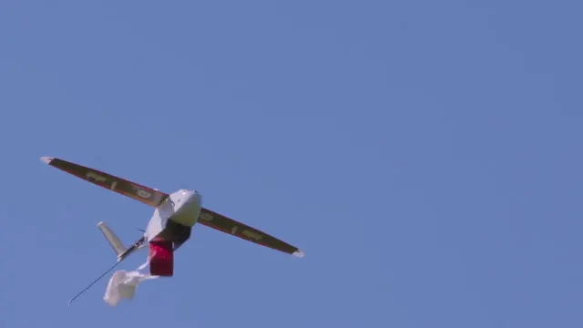 Drone terbang dengan kendali komputer, ketika berada di atas titik tujuan ia akan melepas kantung darah bawaannya dan akan jatuh dengan parasut.