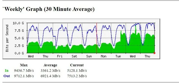 Alfons pun memberikan grafik penggunaan koneksi Telkom ke IIX selama satu minggu ke belakang. Dalam grafik tersebut terlihat kalau memang ada lonjakan akses pada hari Rabu (11/3/2020) dan Kamis (12/3/2020), dan selama beberapa hari sebelumnya pun terlihat kalau bandwidth tersebut sudah hampir mendekati batas 10Gb/s (bandwidth untuk semua server yang disimpan di data center Telkom).