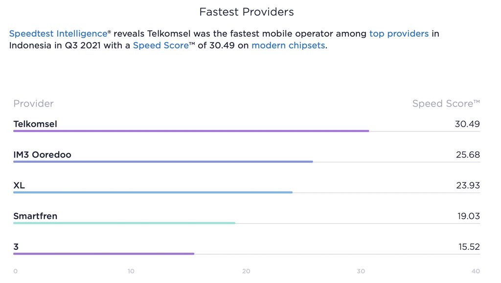 Telkomsel berada di peringkat pertama sebagai operator seluler paling cepat di Indonesia, disusul oleh IM3 Ooredoo, XL, Smartfren, dan 3.