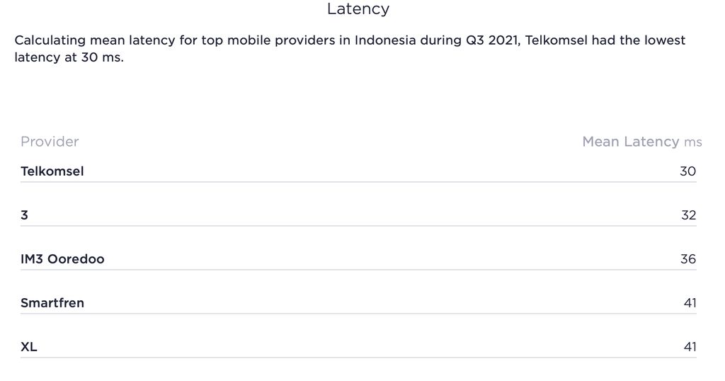 Begitu juga soal latensi, Telkomsel masih unggul. Sedangkan dibelakangnya ada pergeseran poisisi dengan Tri jadi runner up untuk urusan latency sinyal.