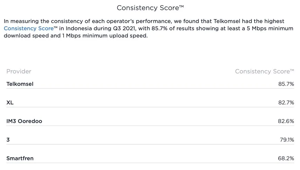 Selain itu, Speedtest juga menguji Consistency Score masing-masing operator seluler, yang tetap menempatkan Telkomsel sebagai jawaranya,