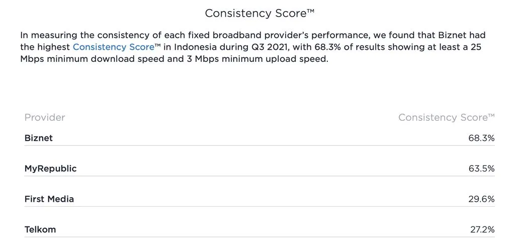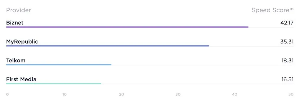 Sedangkan untuk provider fixed broadband, Speedtest menyebutkan bahwa Biznet jadi yang paling atas dengan mencetak skor tertinggi, yaitu 42,17.
