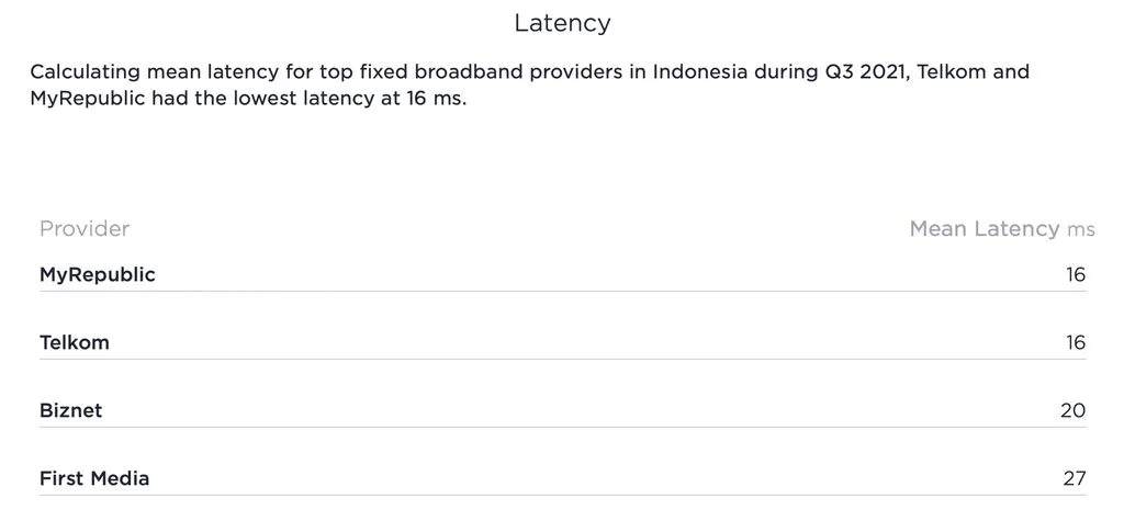 Sementara untuk uji latensi, MyRepublic justru menjadi yang paling rendah latensinya selama Q3 2021 ini, sehingga menempatkannya menjadi nomor wahid dalam urusan latensi bersama dengan Telkom yang memiliki skor latensi serupa.