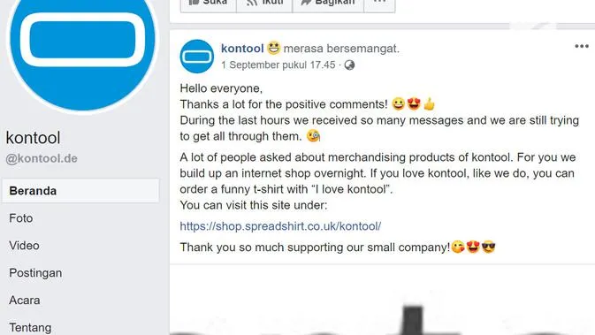 merchandise perusahaan. Dalam unggahan yang berbeda, dikatakan bagi warganet yang suka dengan produk mereka dapat memesan kaos lucu bertuliskan 'I love Kontool'.