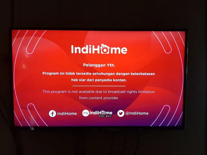 — Nadya Veronica (@nadyaveron) June 3, 2020"Program ini tidak tersedia sehubungan dengan keterbatasan hak siar dari penyedia konten", begitu petikan kalimat yang muncul di layar kaca siaran IndiHome jika menemukan chanel TVRI.