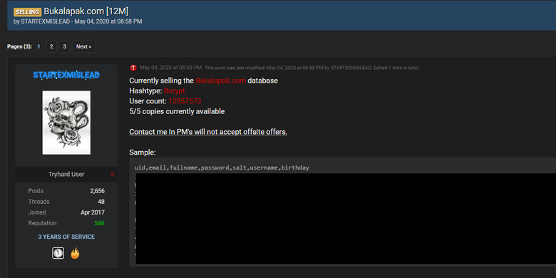 Kemudian, yang lebih baru tepatnya pada 4 Mei lalu, seorang pengguna bernama "STARTEXMISLEAD" juga mengklaim memiliki dan siap menjual hampir 13 juta akun pengguna Bukalapak atau tepatnya sekitar 12.957.573 akun.