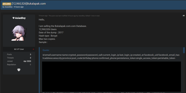 Lalu yang paling baru, tertanggal hari ini 6 Mei, peretas lain dengan nama akun "Asian Boy" mengatakan dirinya juga memiliki hampir 13 juta data pengguna Bukalapak.