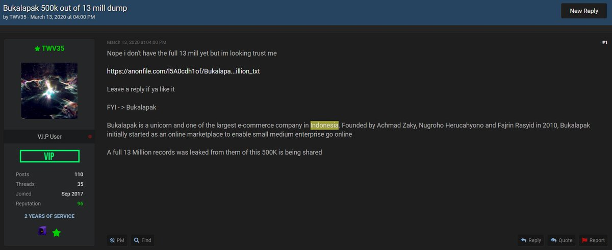 Peretas kedua dengan nama akun "TWV35" juga menawarkan 13 juta catatan dari platform Bukalapak yang bocor.