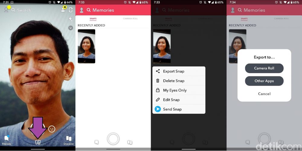 - Ketika muncul sejumlah opsi, tekan Export Snap diikuti Camera Roll.