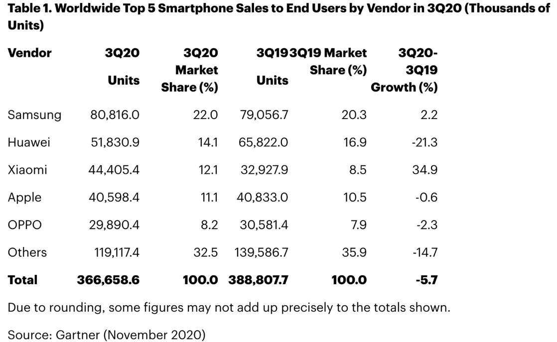 Samsung berada di posisi puncak dan berhasil menjual hampir 2 kali lipat dari total penjualan Apple, tepatnya sejumlah 80,8 juta perangkat. Huawei mengalami penurunan, setelah sebelumnya berhasil menjual 65,8 juta perangkat, kini berhasil menjual 51,8 juta. Hal ini sangat mungkin terjadi karena Amerika Serikat melarang bisnis perusahaan tersebut di negaranya.