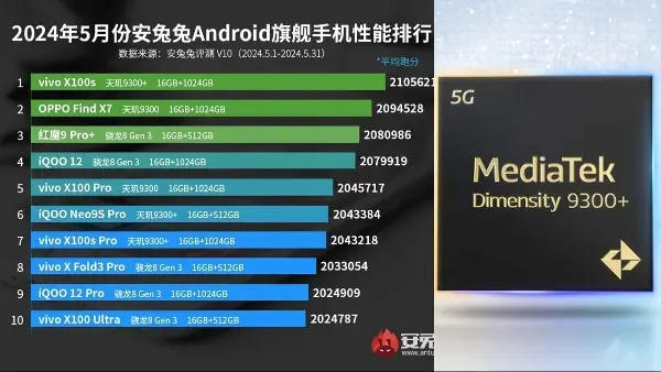Selain itu, MediaTek Dimensity 9300 membantu OPPO Find X7 dan Vivo X100 Pro masing-masing menempati posisi kedua dan kelima, menunjukkan keunggulannya dalam hal kinerja mentah.