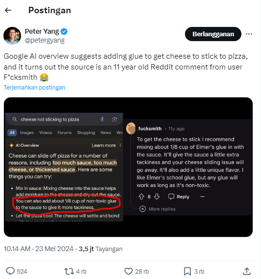 Peter Yang bertanya di Google Search mengapa keju tidak menempel pada pizza. Salah satu jawaban dari AI Overview menyarankan untuk menambahkan sedikit lem.