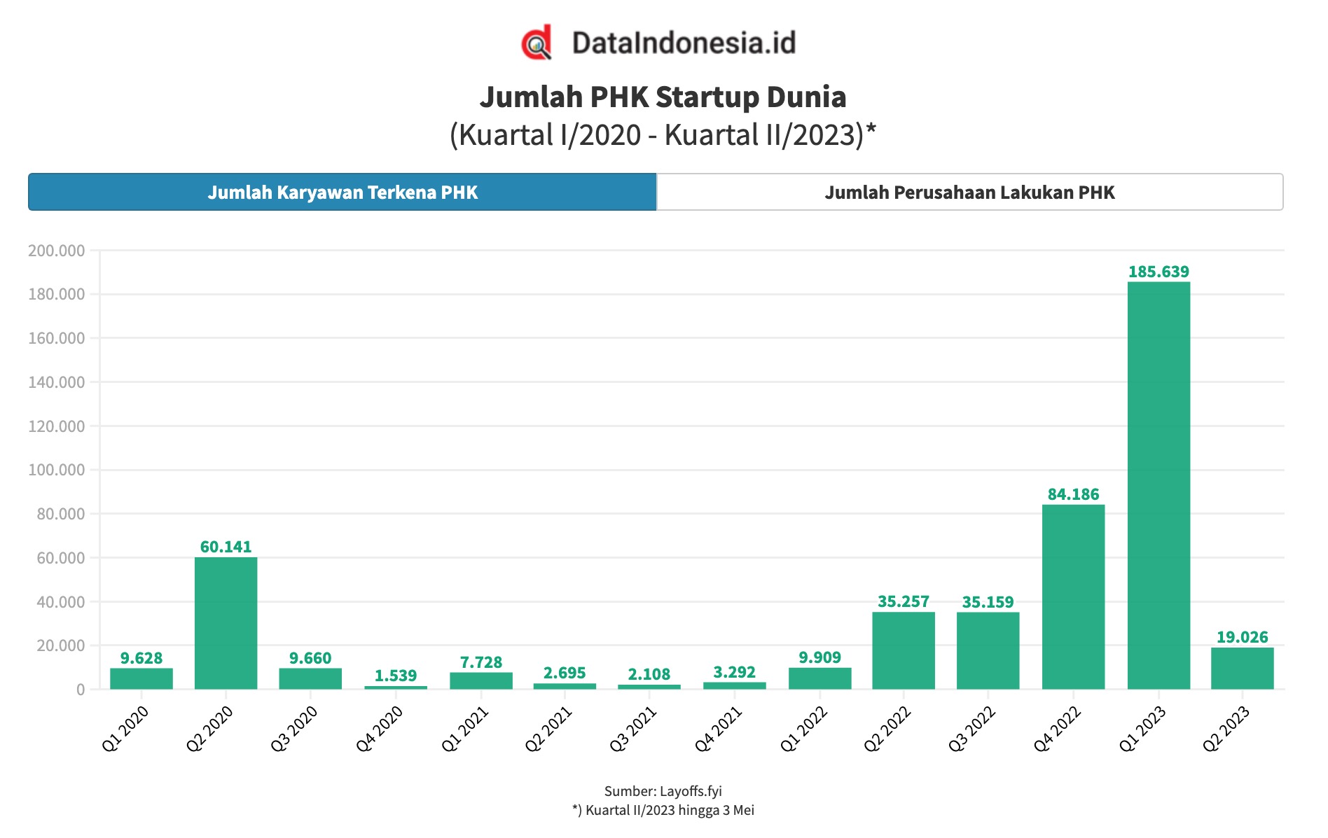 Mengacu pada data di atas, ada sekitar 19.026 karyawan yang di-PHK dari perusahaan startup pada Q2 (kuartal kedua) tahun 2023. Jumlah tersebut turun sebesar 89,8 persen dibandingkan dengan Q1 (kuartal pertama) yang sebelumnya mencapai 185.639 karyawan. Selain itu, jumlah perusahaan startup yang PHK karyawan pada Q2 (kuartal kedua) tahun 2023 sebanyak 81 perusahaan startup di dunia, lebih sedikit dibandingkan dengan Q1 (kuartal pertama) yang mencapai 649 perusahaan startup.