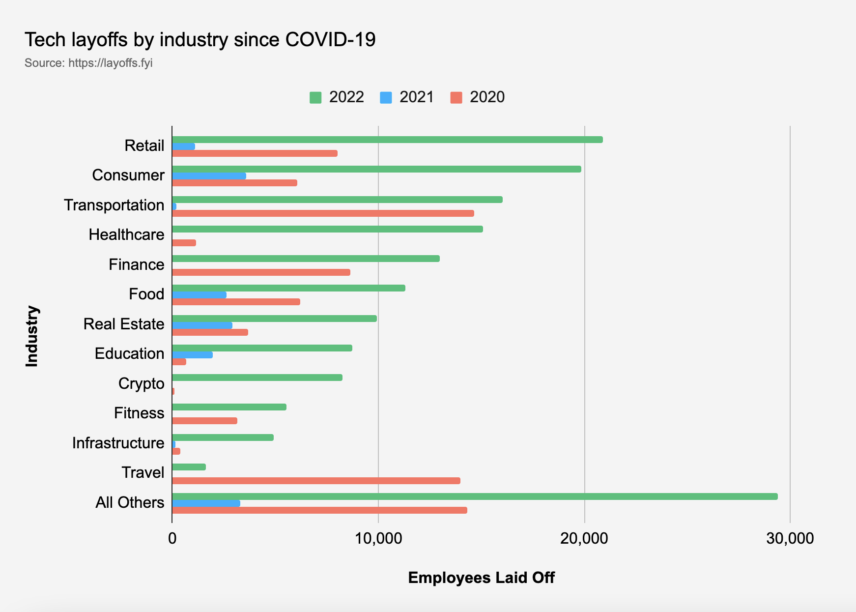 Jika dilihat lebih lanjut, berdasarkan data yang dipublikasikan oleh Layoffs.fyi, bahwa jika dilihat dari sektor perusahaan, maka yang paling banyak melakukan PHK di tahun 2022 adalah sektor ritel, yaitu sebanyak 20.914 karyawan. Diikuti oleh sektor konsumer yang memberhentikan 19.856 karyawan startup. Terdapat sektor infrastruktur yang telah melakukan PHK sebanyak 4.916 karyawan. Sedangkan, untuk startup di sektor travel terlihat paling sedikit melakukan PHK, yakni 1.637 orang.
