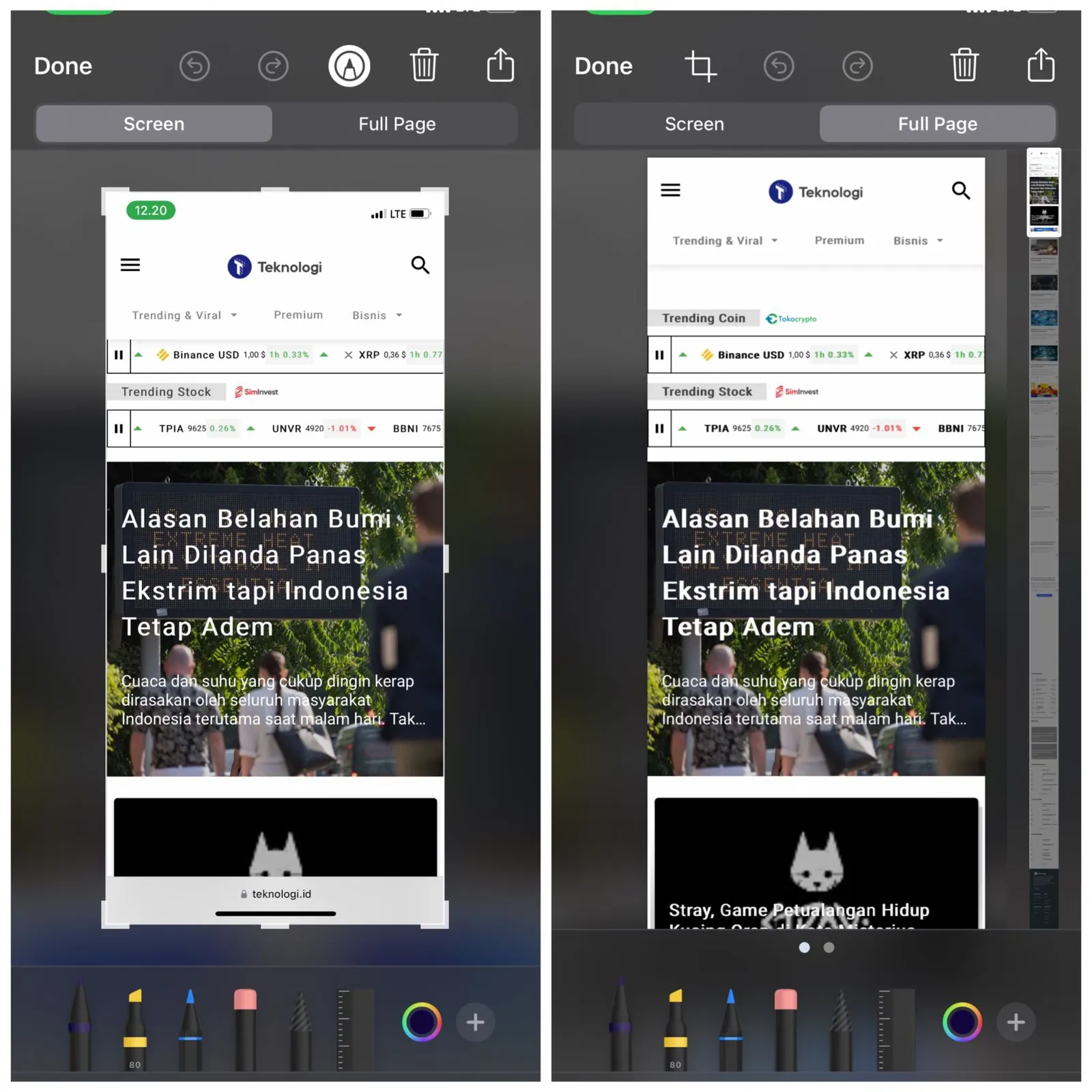 - Setelah menyelesaikan proses edit sesuai yang diinginkan, kamu akan melihat dua opsi di atas gambar tersebut. Opsi tangkapan layar default adalah "Screen" dan disertakan opsi "Full Page" pada sebelah kanan.