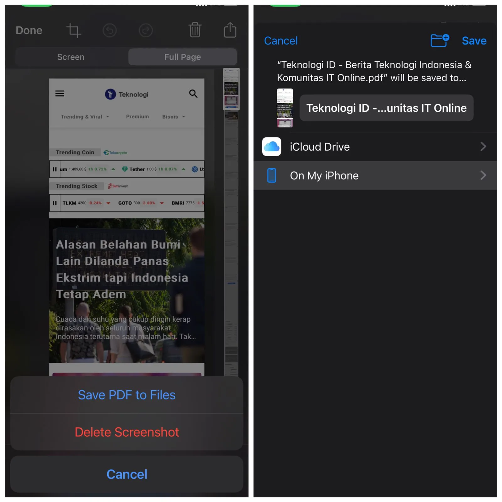 - Jika kamu memilih untuk menyimpan tangkapan layar satu halaman penuh, kamu akan mendapat beberapa opsi, seperti menyimpan tangkapan layar ke folder di iCloud Drive atau menyimpannya ke iPhone di folder.