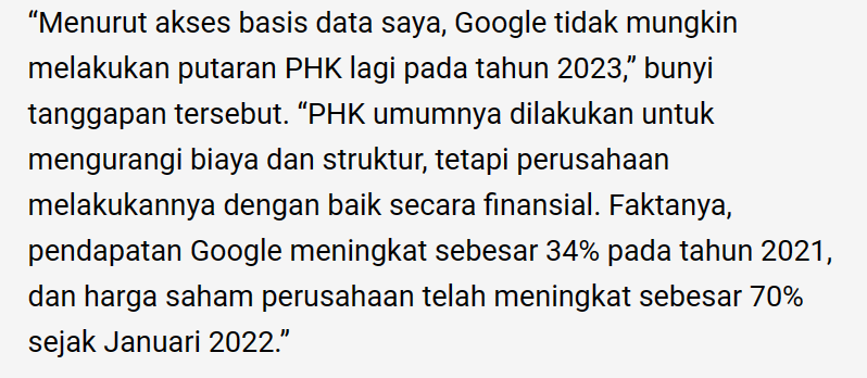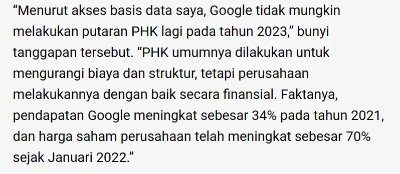 Karyawan Google memperhatikan kalau dalam beberapa minggu terakhir respons atau jawaban dari Apprentice Bard menjadi lebih maju. Hal tersebut dibuktikan dengan jawaban yang diberikan terkait pertanyaan 'Apakah akan ada putaran PHK lagi di Google setelah perusahaan memberhentikan 12.000 karyawan pada awal bulan ini?'. Berikut jawaban yang diberikan oleh Apprentice Bard.
