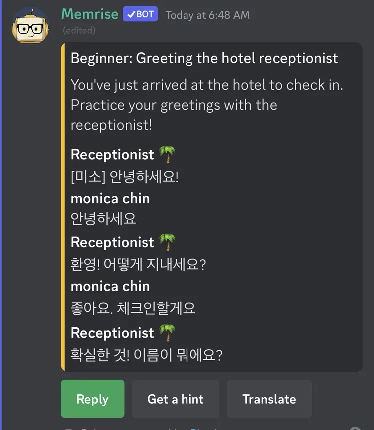 Jika sudah, tekan enter. Dan kamu akan memulai percakapan dengan bot yang mensimulasikan salah satu dari 50 skenario dunia nyata. Beberapa di antaranya standar (seperti ingin check-in hotel), dan beberapa agak aneh (ketika kamu bertemu dengan seorang lelaki tua di jalan yang ingin tahu siapa dan dari mana kamu berasal).