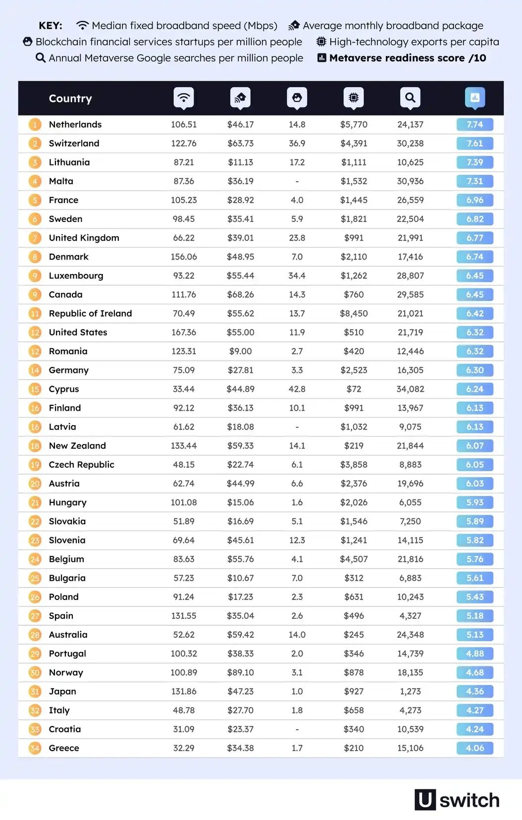 Penilaian Uswitch didasarkan oleh sejumlah faktor di antaranya kecepatan broadband di negara tersebut, rata-rata paket broadband, kehadiran startup untuk layanan keuangan berbasis blockchain, ekspor perangkat teknologi tinggi per kapita, dan tingkat pencarian metaverse Google tahunan dalam negeri per satu juta orang.
