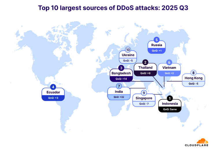 Menurut laporan Cloudflare, volume lalu lintas serangan yang berasal dari alamat IP (Internet Protocol) Indonesia sangat masif. Peta ancaman global Cloudflare menyusun daftar 10 negara sumber serangan terbesar sebagai berikut: