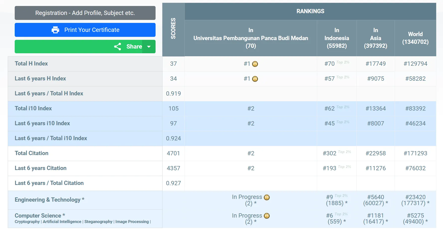 Dengan hasil skor yang tertera di bawah ini Andysah Putera Utama Siahaan berhasil menempati peringkat #1 Universitas (Universitas Pembangunan Panca Budi Medan), #70 Indonesia, #17749, dan #129794 Dunia secara keseluruhan subjek yang termasuk ke dalam kategori AD Scientific Index 2023.