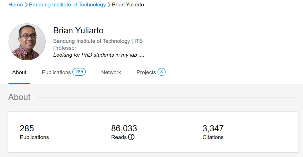 Teknologi.id - Brian Yuliarto menjadi dosen teknologi dari Institut Teknologi Bandung yang menempati peringkat 18 'Indonesia Top 10.000 Scientist' kategori Subjek Engineering & Technology. Pemeringkatan ini dilakukan oleh AD Scientific Index yang merupakan sistem pemeringkatan dan analisis tahunan berdasarkan kinerja ilmiah dan produktivitas dari sebuah universitas dan/atau seorang ilmuan.