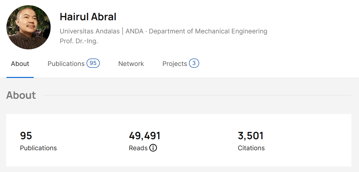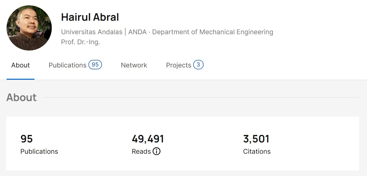 Teknologi.id - Hairul Abral menjadi dosen teknologi dari Universitas Andalas yang menempati peringkat 16 'Indonesia Top 10.000 Scientist' kategori Subjek Engineering & Technology. Pemeringkatan ini dilakukan oleh AD Scientific Index yang merupakan sistem pemeringkatan dan analisis tahunan berdasarkan kinerja ilmiah dan produktivitas, seperti parameter total, 5 tahun terakhir, dan rata-rata dari i10-index, h-index, dan citation score seorang ilmuan.