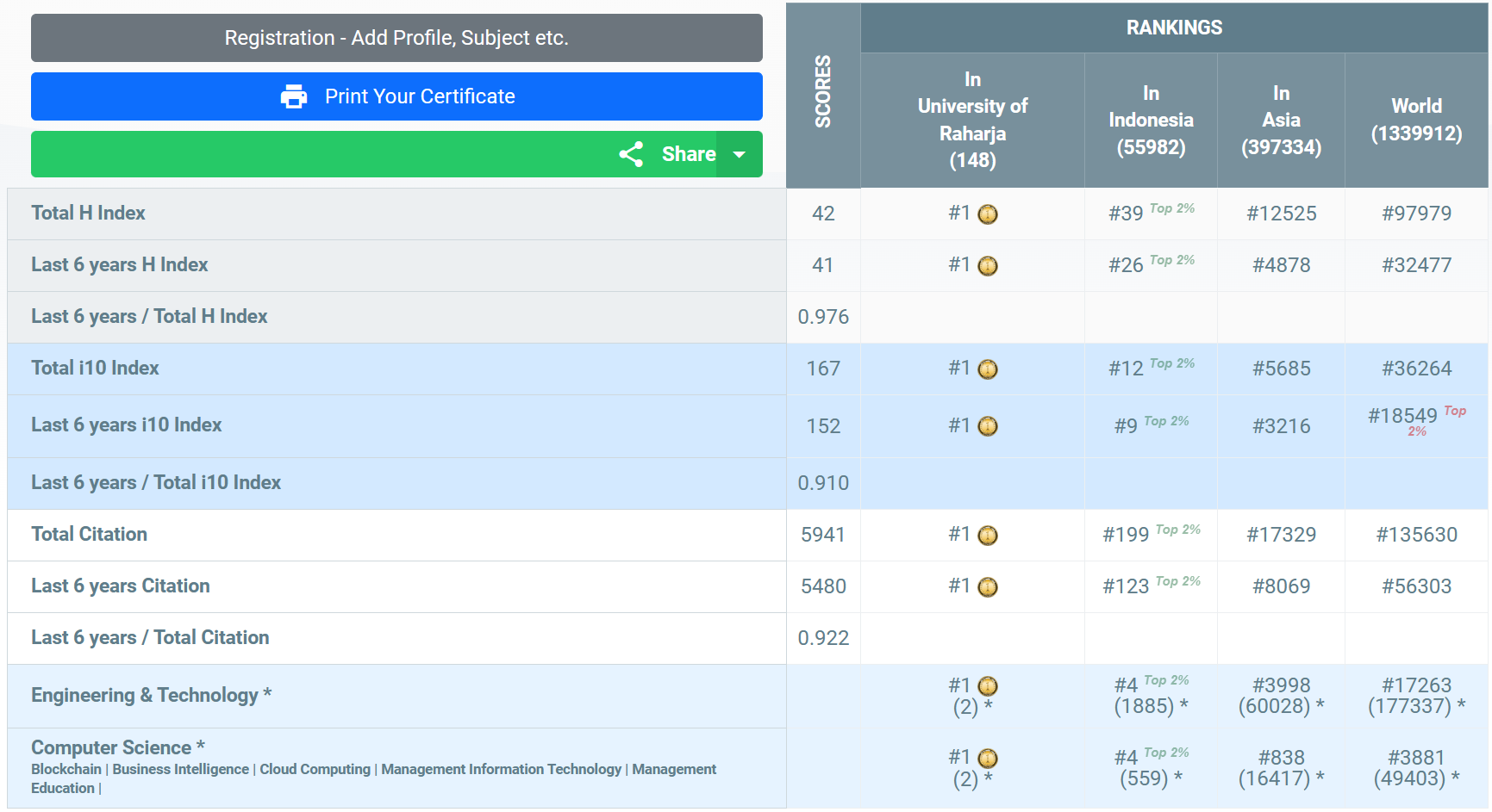 Dengan hasil skor yang tertera di bawah, Untung Rahardja menempati peringkat #1 Universitas, #39 Indonesia, #12525 Asia, dan #97979 Dunia secara keseluruhan subjek yang termasuk ke dalam kategori AD Scientific Index 2023.