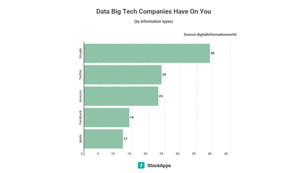 Menurut analisis terbaru oleh StockApps.com, Google adalah perusahaan yang mengumpulkan data pengguna terbanyak. Kemudian, diikuti oleh raksasa teknologi lainnya seperti Twitter, Amazon, Facebook dan Apple.