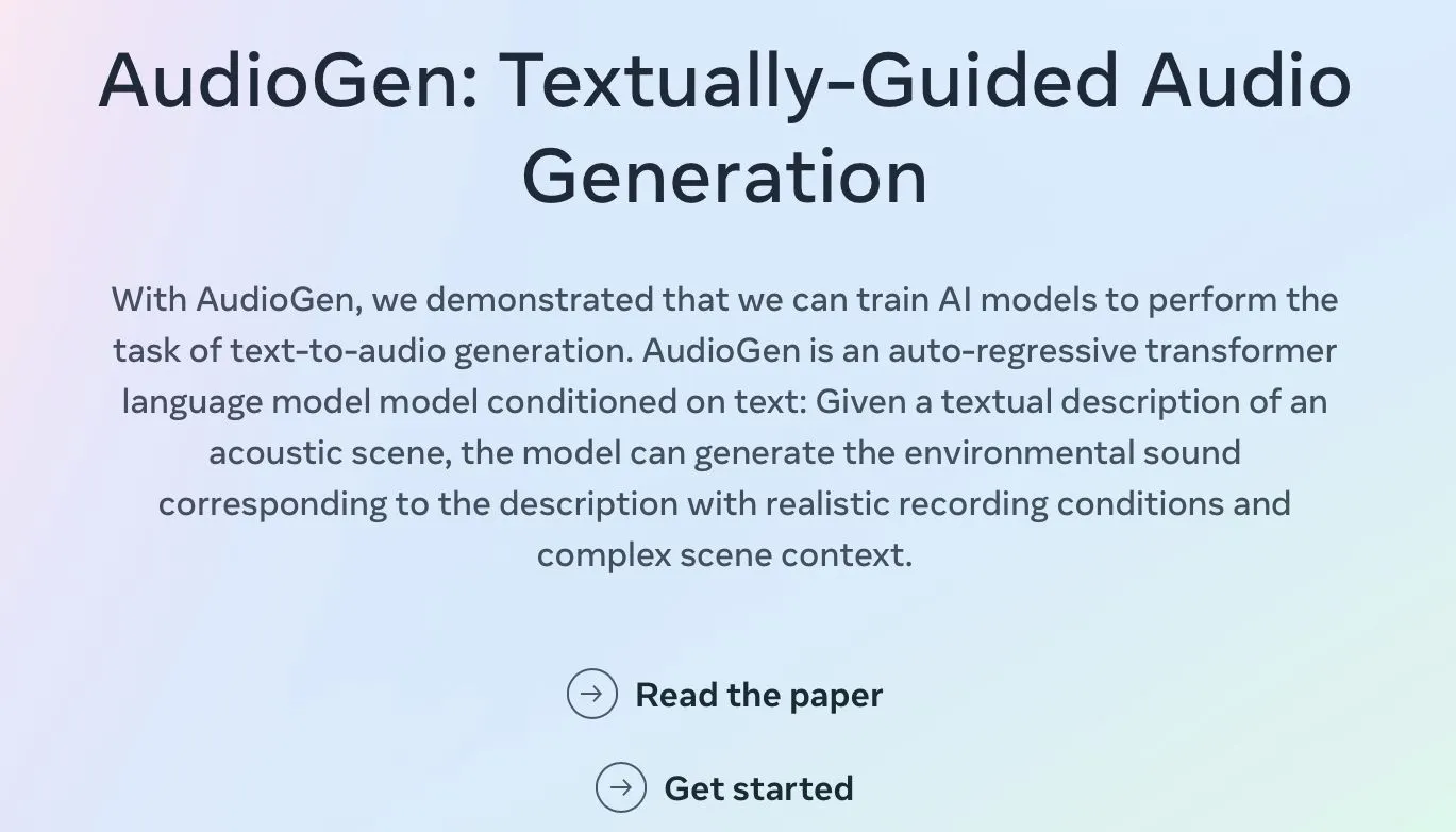 Audiogen sendiri tidak difokuskan pada pembuatan melodi dan musik, melainkan dibuat sebagai pengahasil audio yang berfokus pada suara lingkungan dan efek suara. Melalui deskripsi teks, AudioGen dapat menghasilkan suara lingkungan yang realistis dan kompleks. Selain itu, Audiogen juga bisa menghasilkan perintah dari prompt selain musik karena disusun beradasarkan data pelatihan yang beragam.