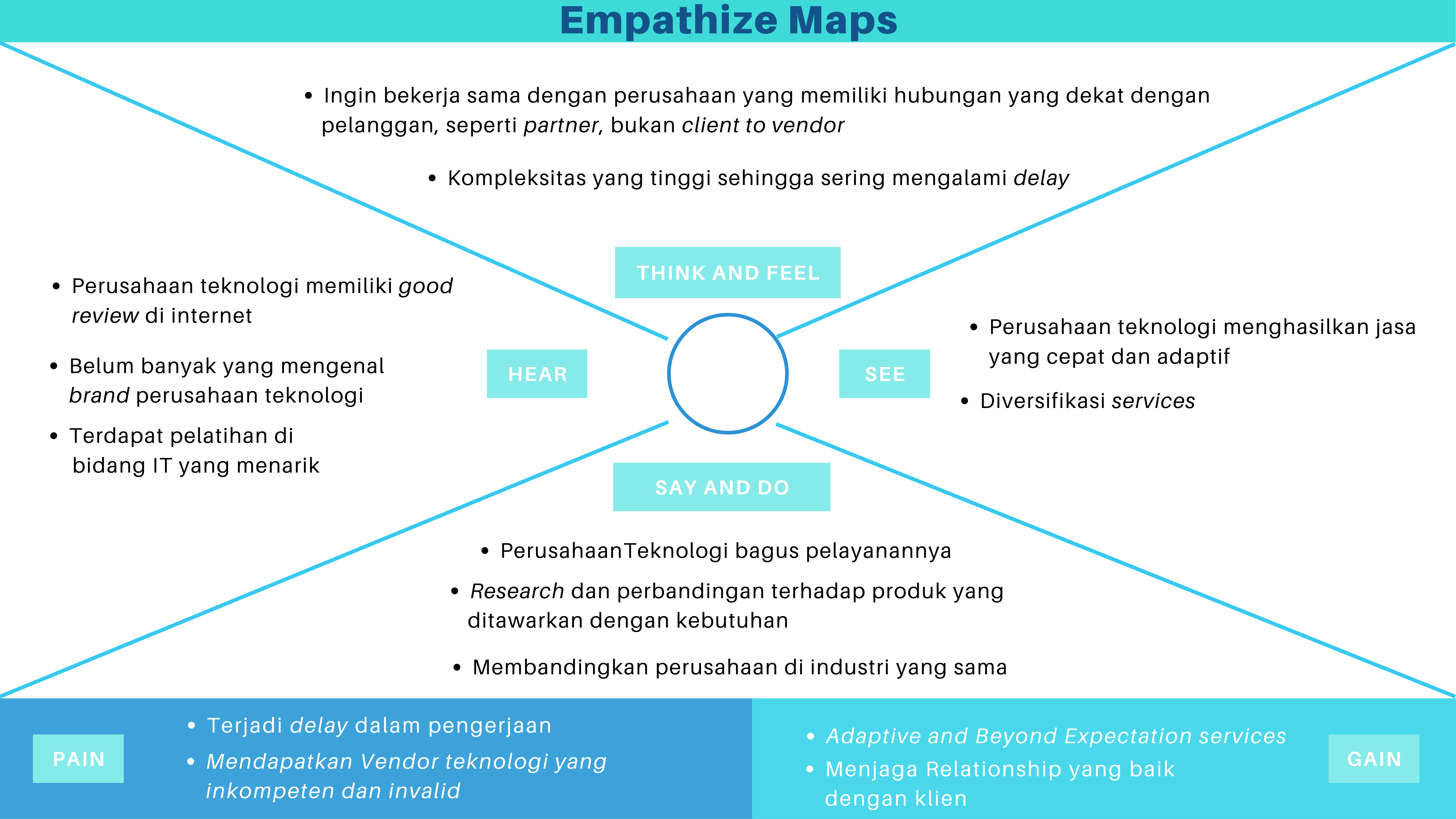 Sagara Technology menggunakan empathize map sebagai metode untuk mengenal kebutuhan dan keinginan konsumen serta menyelaraskannya dengan strategi bisnis perusahaan. Fokus yang telah disajikan pada gambar menghasilkan pain mengenai kebutuhan yang masih harus dipenuhi untuk menciptakan kepuasan konsumen, sedangkan gain merupakan nilai tambah yang dimiliki perusahaan dari perspektif konsumen.