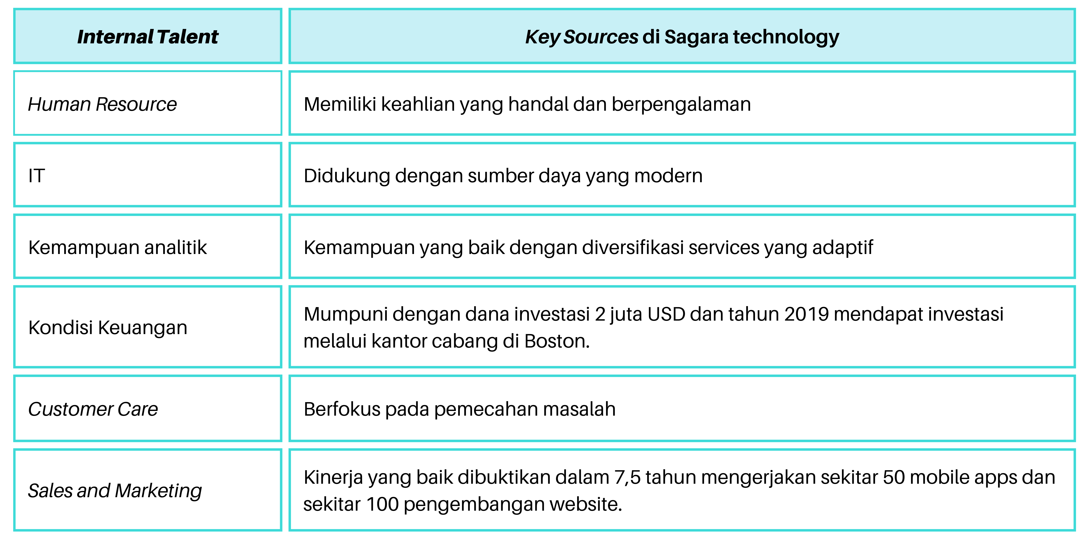 Kebanyakan perusahaan teknologi saat ini menjalin kerjasama dengan berbagai penyedia teknologi, integrator, dan vendor lainnya untuk membangun koneksi demi membentuk suatu ekosistem teknologi yang lebih komprehensif. Melalui orchestrator model, Sagara Technology memiliki resource mumpuni untuk dapat melayani tugas-tugas besar dari key partner berbagai perusahaan besar dan ternama, BUMN, startup, lembaga keuangan, lembaga pemerintahan, dan lembaga non profit dan memiliki key sources mumpuni pada tabel berikut.