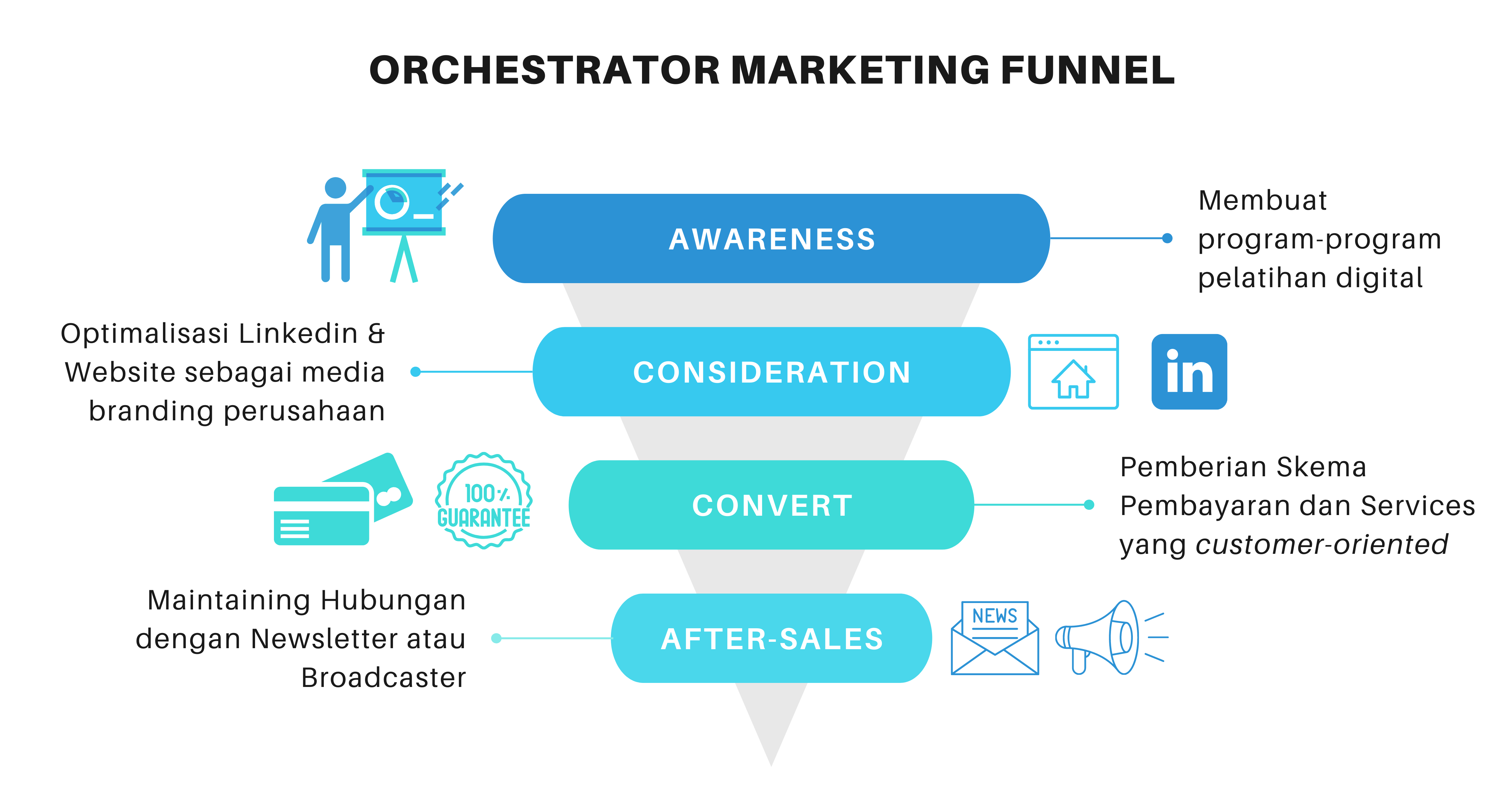 Orchestrator Marketing Funnel di atas adalah contoh penyusunan strategi marketing sistematis yang berlandaskan pada kemampuan internal dan juga peluang eksternal perusahaan. Selain itu funnel ini bersifat customer-based oriented dengan pendalaman strategi berbasis pain-gain dari calon konsumen. Oleh karena itu, strategi funnel ini akan jauh lebih murah, karena strategi yang dijalankan memposisikan perusahaan sebagai orchestrator. Lebih jauh lagi ke depannya, funnel ini bukan hanya sekedar pendekatan marketing, tapi sebuah model bisnis baru yang dapat mendongkrak perusahaan agar maju lebih pesat.