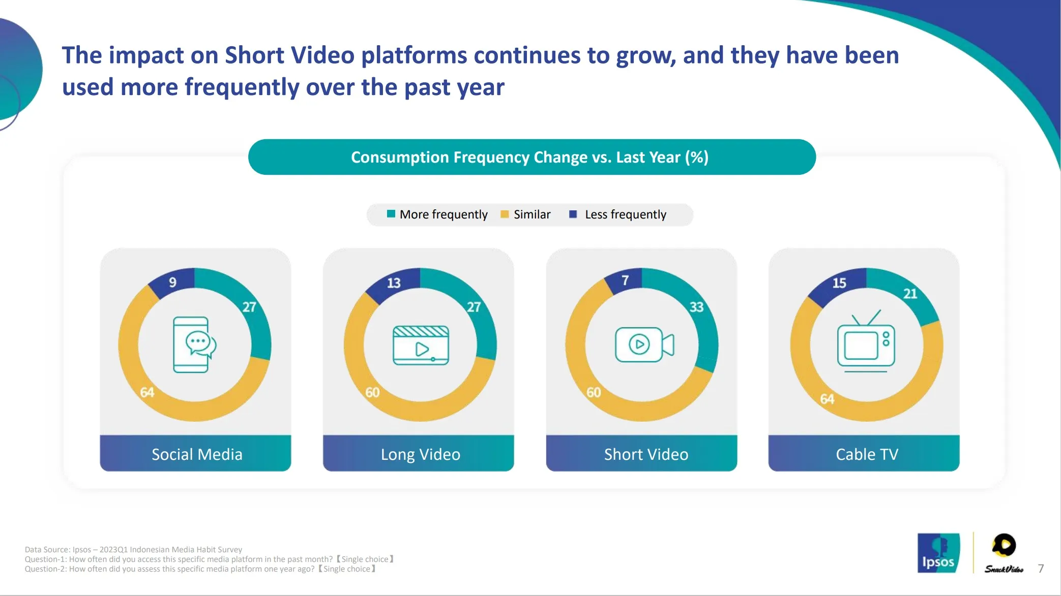 Selain tentang rata-rata waktu yang dihabiskan bermain HP (handphone), adapun Lembaga Riset Pasar Global Ipsos menerbitkan laporan survei dalam laporan Indonesia Short Video White Paper 2023 pada hari Selasa (07/03/2023). Laporan ini menyoroti akses masyarakat Indonesia terhadap media dan menunjukkan kebangkitan platform video pendek menjadi menonjol di sektor industri.