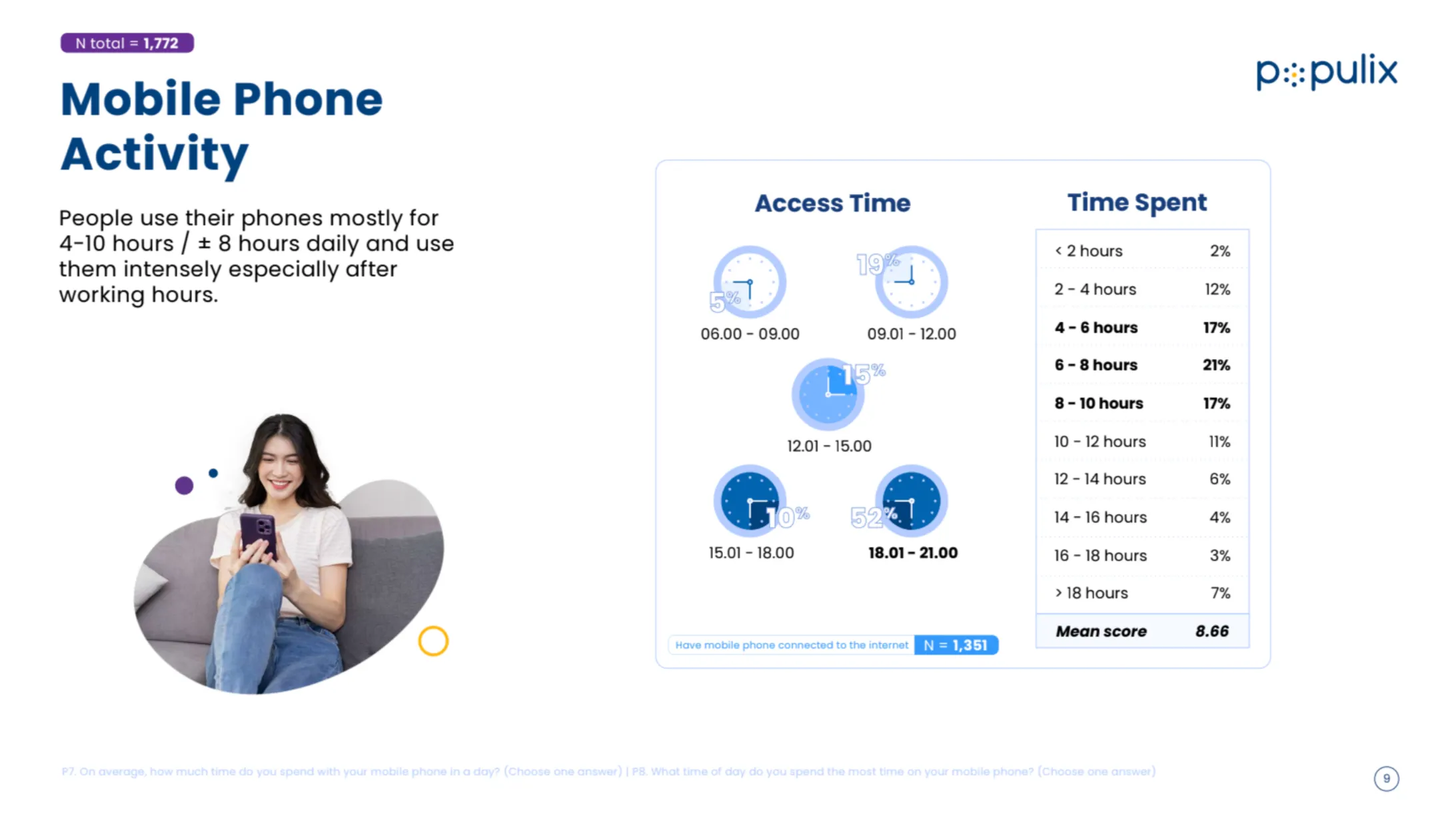 Berdasarkan data dari survei Populix dalam Omnichannel Digital Consumption Report 2023, yaitu menunjukkan bagaimana masyarakat di Indonesia menggunakan HP (handphone), dimana mayoritas waktu yang paling banyak diluangkan adalah antara 4-10 jam dan sekitar 8 jam setiap hari dengan penggunaan yang intens terutama setelah jam kerja. Sementara itu, waktu yang paling sering digunakan adalah dari jam 6 sore hingga 9 malam, disusul kedua dari jam 9 pagi hingga 12 malam, dan ketiga dari jam 12 malam hingga jam 3 sore.