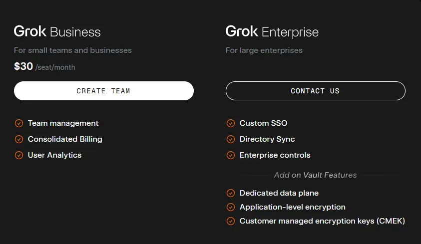 Sementara itu, Grok Enterprise ditujukan bagi perusahaan berskala besar dengan kebutuhan keamanan dan kontrol yang lebih ketat. Meski harganya tidak diumumkan ke publik, xAI mengarahkan perusahaan untuk dapat menghubungi langsung. Paket Enterprise menghadirkan fitur tambahan lebih lanjut yang tentunya dapat sangat membantu perusahaan skala besar, seperti custom Single Sign-On (SSO), sinkronisasi direktori pengguna melalui SCIM, serta kontrol keamanan dan audit tingkat lanjut.