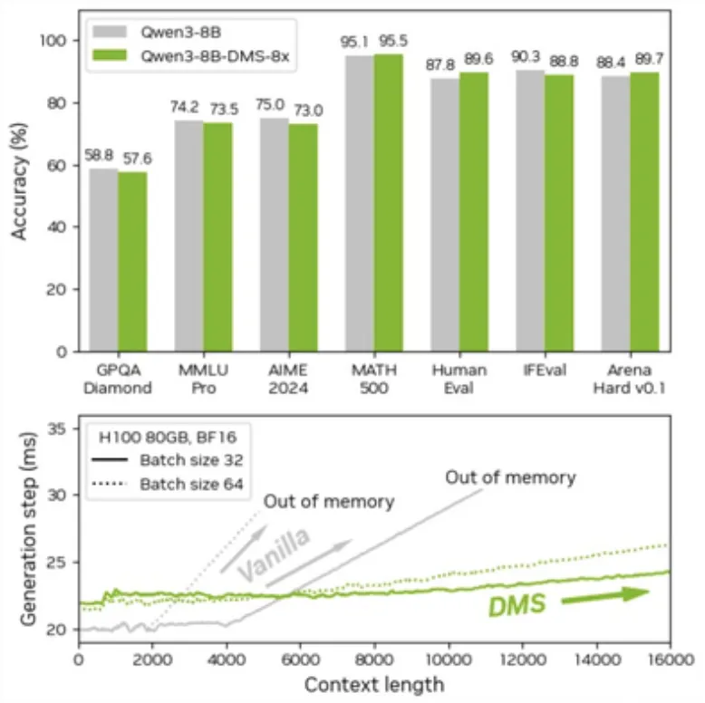 Dalam pengujian yang dilakukan pada sejumlah model populer seperti Qwen dan Llama, DMS menunjukkan hasil yang sangat impresif. Pada model Qwen3-8B, misalnya, tingkat akurasi tetap identik di berbagai benchmark penalaran seperti MATH 500, HumanEval, hingga AIME 2024. Bahkan, dalam beberapa skenario pengkodean (coding) dan matematika, model dengan DMS mencatat skor yang sedikit lebih tinggi dibanding versi standar.