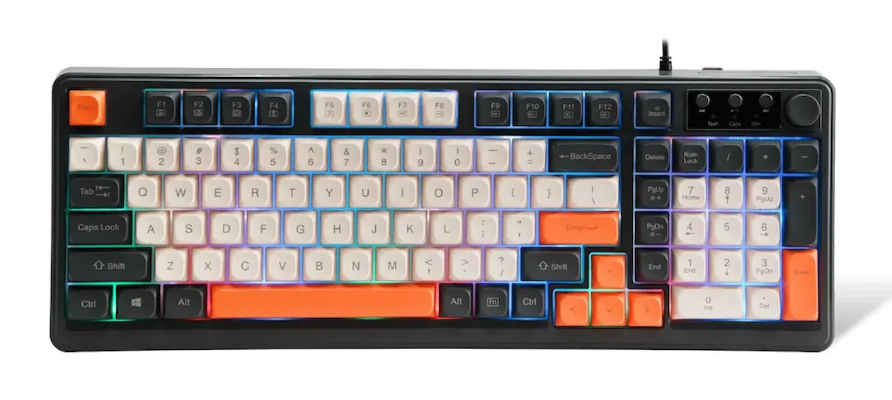 Pada area panel, terdapat deretan tombol multimedia khusus yang sudah terintegrasi langsung dengan sebuah kenop pengatur volume suara (Volume Knob). Dari sisi pencahayaan perangkat, papan ketik ini dipercantik dengan sistem cahaya latar berwarna-warni (Rainbow Backlight) untuk memberikan tampilan produk yang lebih dinamis.