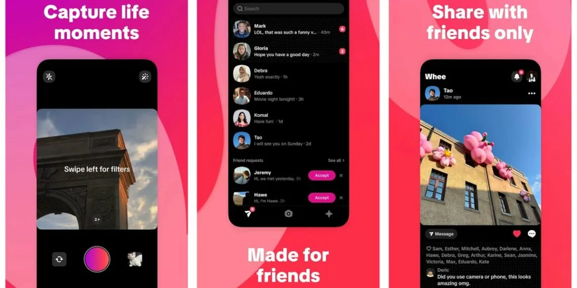 Menurut deskripsi di Google Play Store, Whee "adalah aplikasi sosial baru yang dibuat untuk membuat Anda tetap terhubung dengan teman-teman dekat Anda melalui momen-momen spontan dalam hidup." Pada dasarnya, Whee adalah aplikasi yang memungkinkan pengguna untuk mengambil dan berbagi foto kehidupan nyata dengan teman-teman mereka.