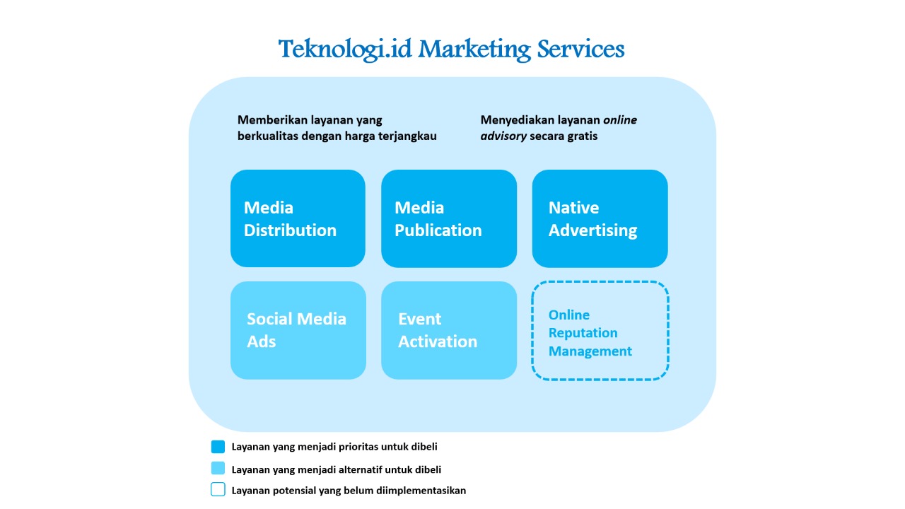 Dalam persaingan bisnis di Indonesia, perusahaan rintisan harus melakukan berbagai implementasi strategi untuk menjadi market leader. Ada banyak strategi yang bisa dilakukan, salah satunya adalah memperkuat online presence baik melalui social media maupun online media marketing. Online presence sebagai strategi pemasaran dalam hal ini menjadi sangat penting karena dengan adanya online presence yang kuat, tentu menjadi faktor penting dalam pengembangan startup (Siswanto et al, 2020) sehingga menghasilkan posisi perusahaan yang sukses dan keterlibatan dengan audiens bisnis yang lebih luas (Cartwright dan Raddats, 2021) serta memiliki peluang lebih besar untuk menjadi pemimpin pasar. Akan tetapi, membangun online presence tidak semudah yang dipikirkan. Dalam hal ini, Teknologi.id hadir untuk menjawab masalah tersebut. Sebagai penyedia jasa yang membangun online presence perusahaan, Teknologi.id dapat mempermudah perusahaan dengan produk-produk yang ditawarkannya. Teknologi.id memberikan penawaran menarik terkait marketing services bagi para startup untuk berinvestasi memperkuat online presence mereka.
