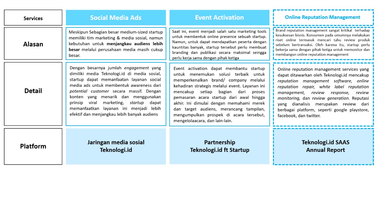 Dari lima marketing services yang telah ditawarkan, tiga diantaranya merupakan layanan prioritas bagi startup dari ketiga industri, dan dua merupakan layanan alternatif. Lalu, terdapat satu potential marketing services yang dapat ditawarkan oleh Teknologi.id kepada startup pada industri fintech, e-commerce, dan SAAS, yaitu online reputation management services.
