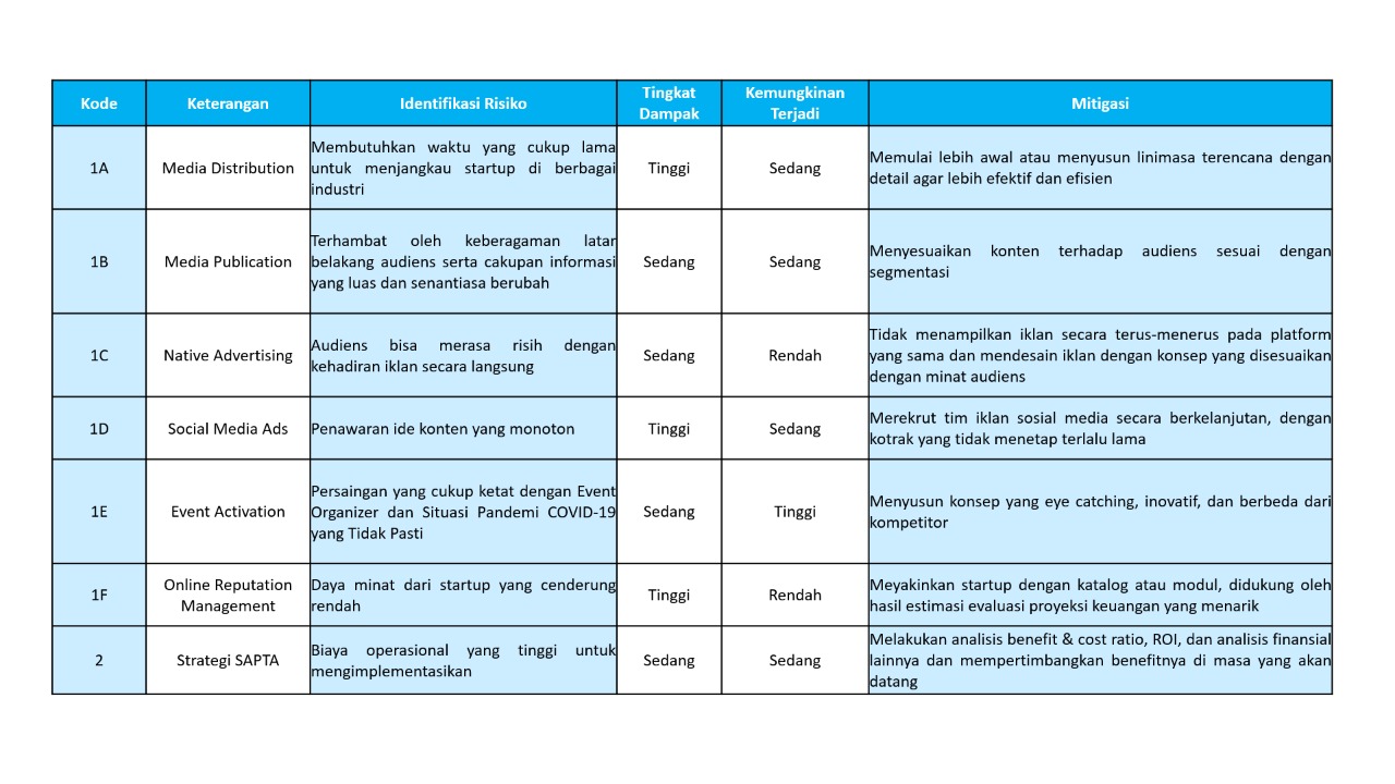 Untuk mengantisipasi risiko yang mungkin terjadi dalam penerapan solusi yang ditawarkan, telah disusun identifikasi risiko yang mungkin terjadi serta langkah-langkah berupa rencana mitigasi untuk mengurangi potensi terjadinya risiko sebagai berikut.