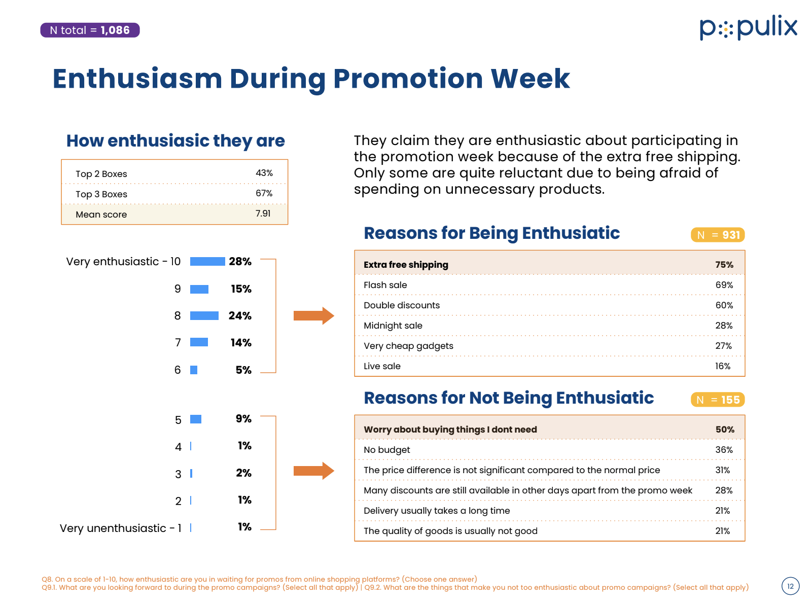 Adapun 15 persen (dari peringkat 1-5) bahwa responden tidak terlalu antusias, alasannya karena takut membeli barang yang tidak dibutuhkan sebesar 50 persen, tidak memiliki uang sebesar 36 persen, dan harganya tidak terlalu beda jauh dari harga normal sebesar 31 persen. Meskipun begitu, mayoritas konsumen tetap menantikan program kampanye promosi ini.
